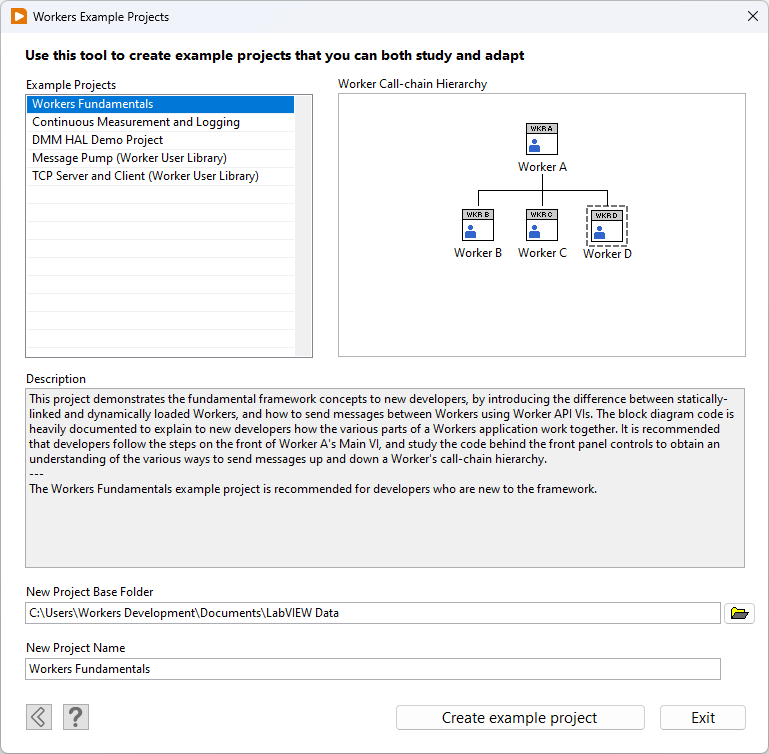 The Workers Fundamentals sample project demonstrates the basic concepts of the framework and is the recommended starting project for developers who are new to the framework. The code in this example project is heavily commented. This project demonstrates the difference between [statically-linked and dynamically loaded](https://docs.workersforlabview.io/fundamental-concepts/subworker-types) Workers, and demonstrates how to use the four different type of [Worker API](https://docs.workersforlabview.io/worker-apis) VIs.