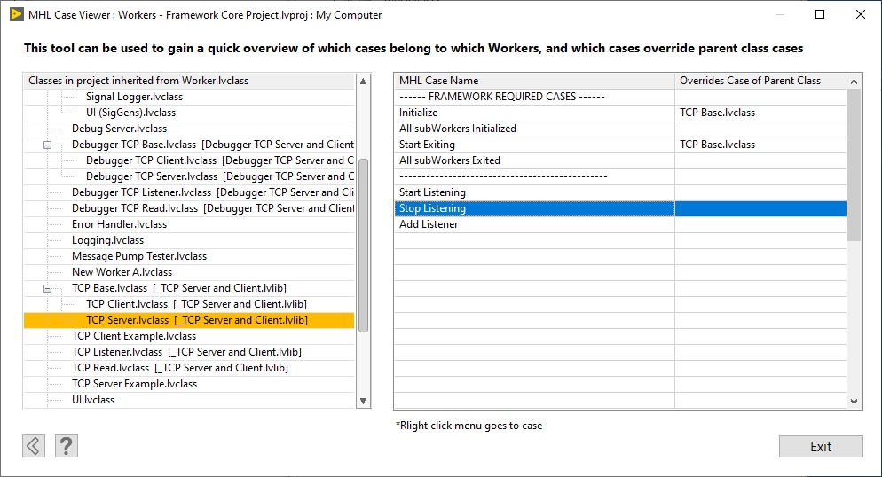 This column shows all the MHL cases that exist within a Workers MHL's case structure or a base class's MHL Cases.vi case structure.